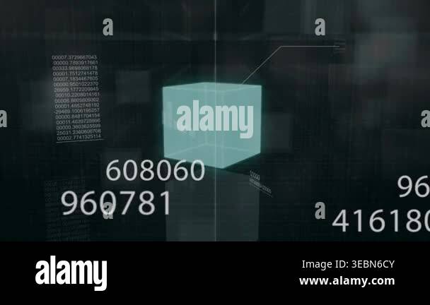 Animation of data processing over cube on black background. global ...