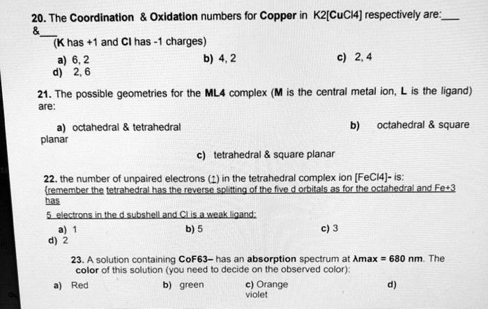 SOLVED: 20. The Coordination Oxidation numbers for Copper in K2[CuCl4 ...