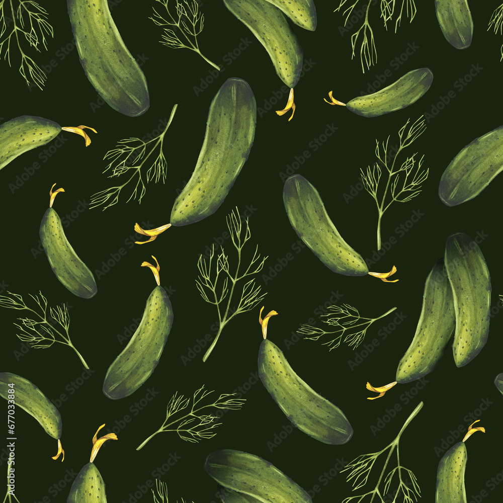 Seamless pattern of cucumbers and dill. Watercolor illustration of ...