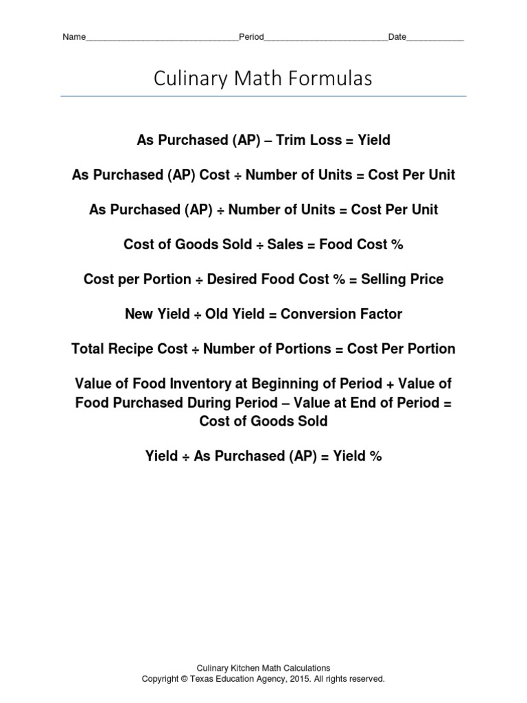Culinary Kitchen Math Calculations Copyright Texas Education Agency