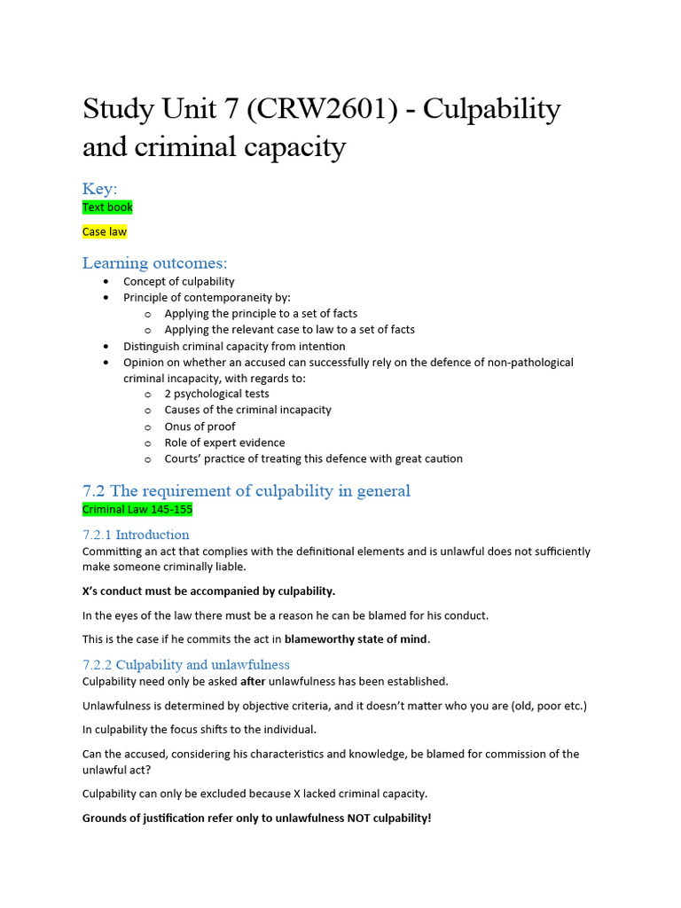 CRW2601 Study Unit 7 Culpability and Criminal Capacity | PDF ...