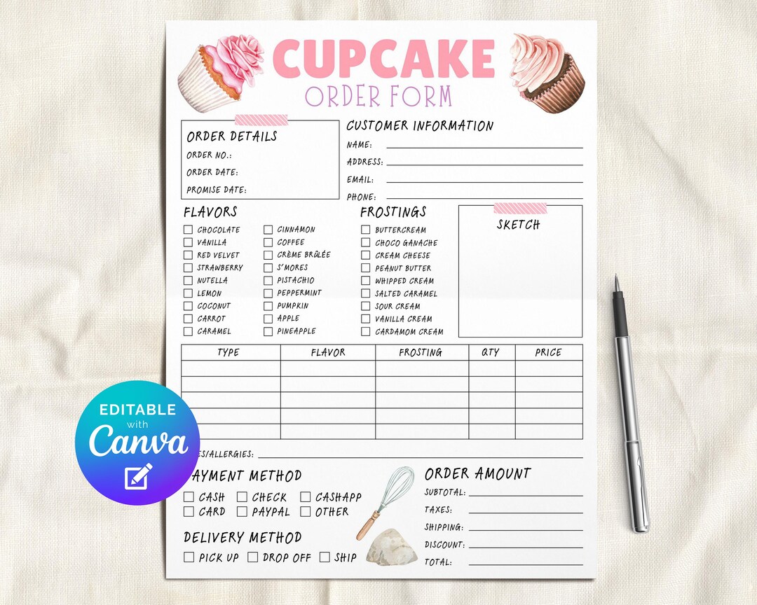 Cupcake Order Form Editable Template, Cake Invoice Form, Custom Order ...