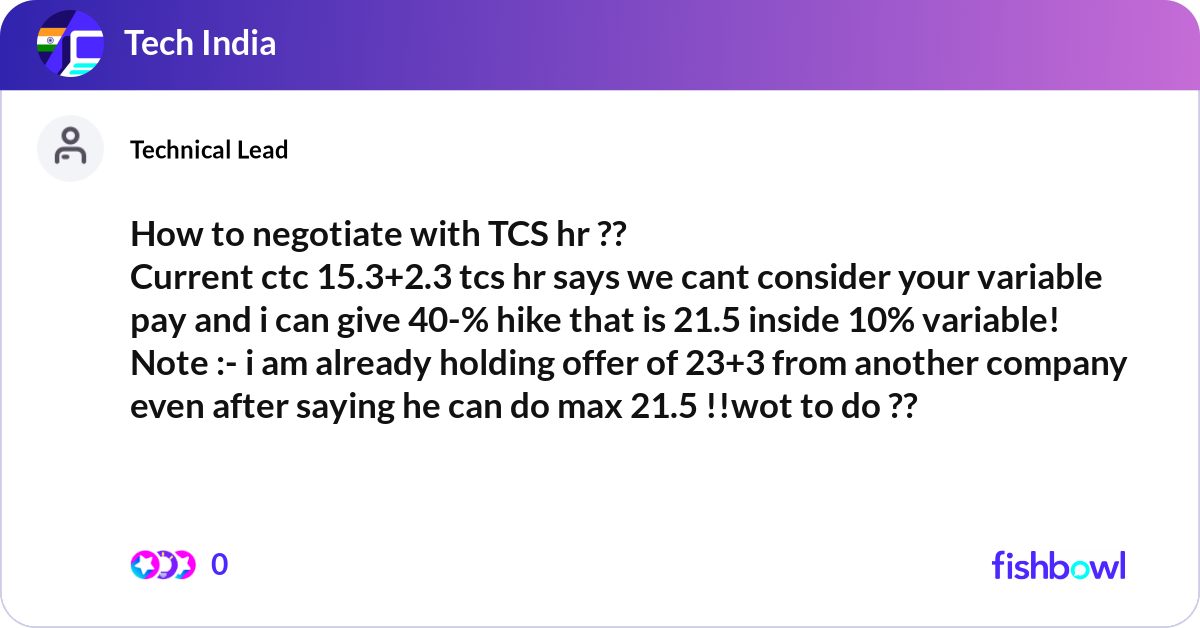 How to negotiate with TCS hr ?? Current ctc 15.3+2... | Fishbowl