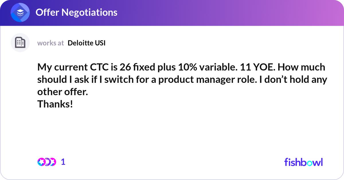 My current CTC is 26 fixed plus 10% variable. 11 Y... | Fishbowl