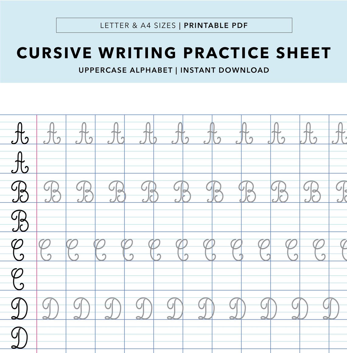 Cursive Writing Practice Sheet: Uppercase Alphabet, French Ruled Paper ...