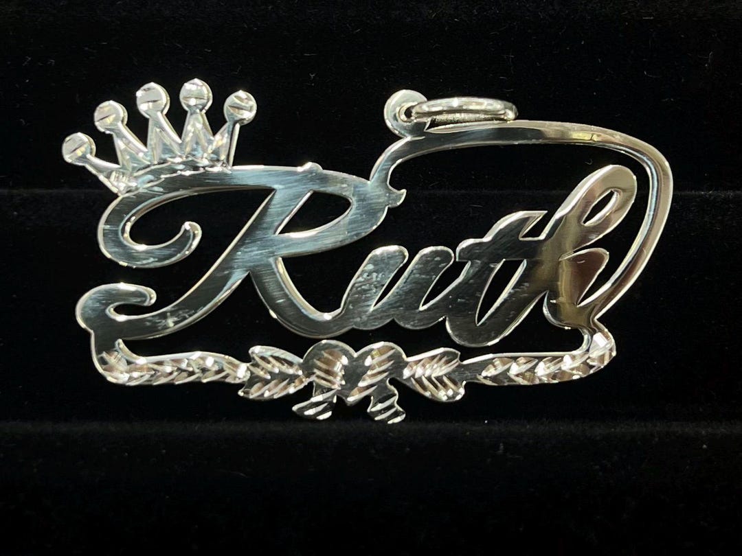 Custom Cursive Silver Nameplate Pendant: Crown & Heart Bow ...