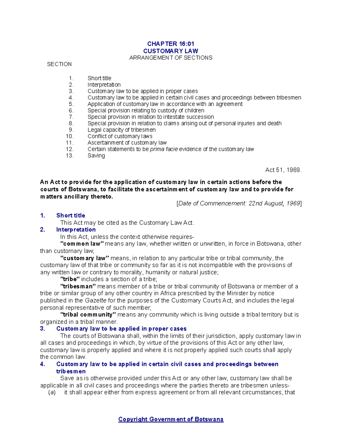 Customary Law Act - Comprehensive Overview and Provisions - Studocu