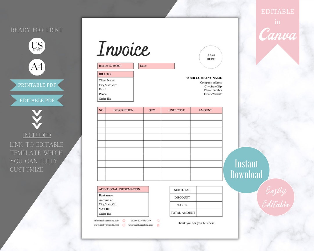 Invoice Template Editable PDF Instant Digital Download, Custom ...