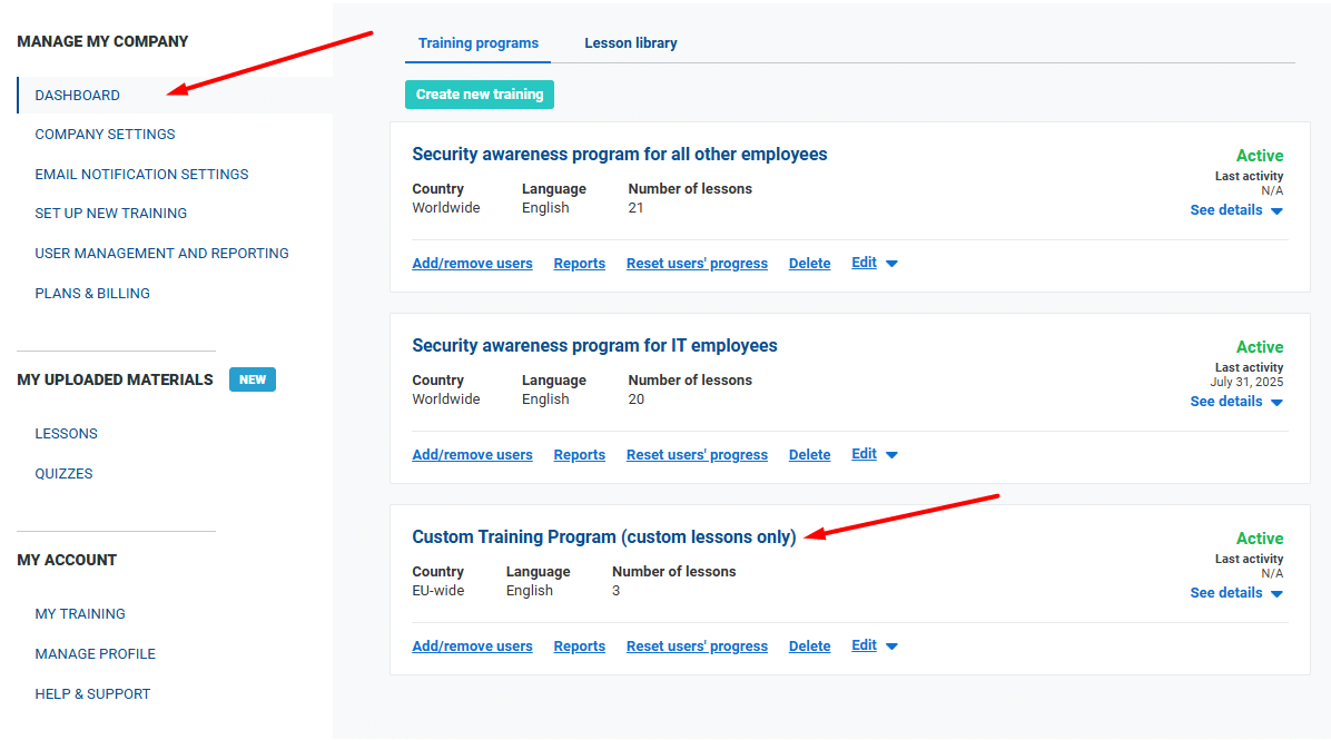 How to use custom lessons in training programs | Advisera Help Center