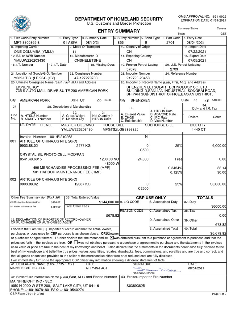 US Customs Entry Summary 7501