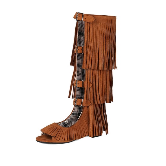 Brown Women'S Fringe High Top Sandals Buckle Strap Open Toe Cut Out Non ...