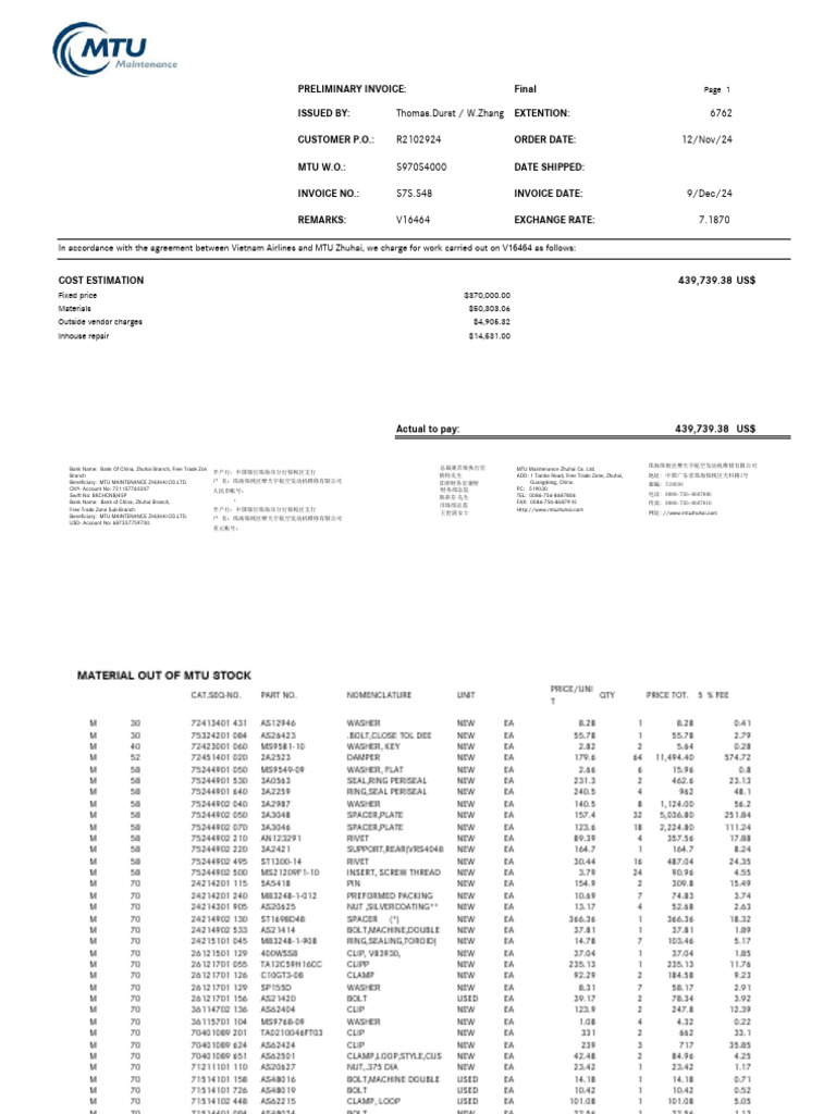 Vietnam Airlines Preliminary Invoice | PDF | Washer (Hardware) | Screw