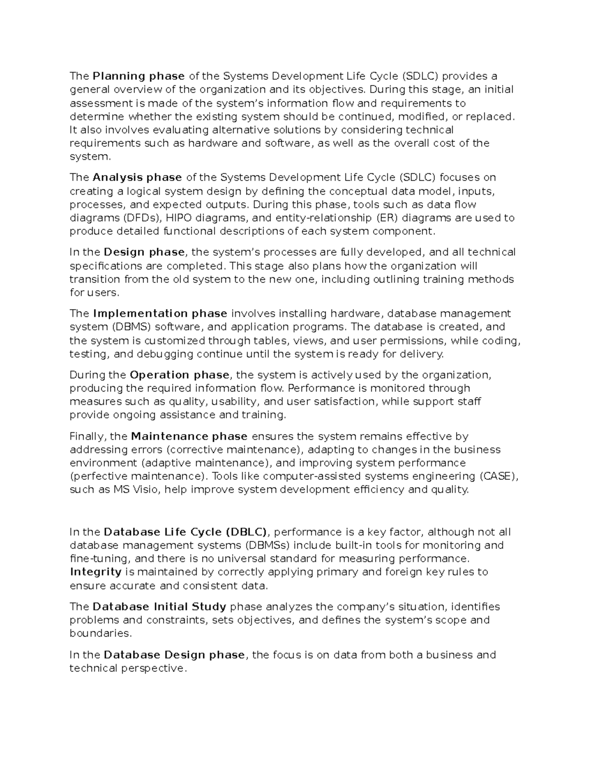 SDLC Overview: Phases, Design, and Database Management Insights - Studocu