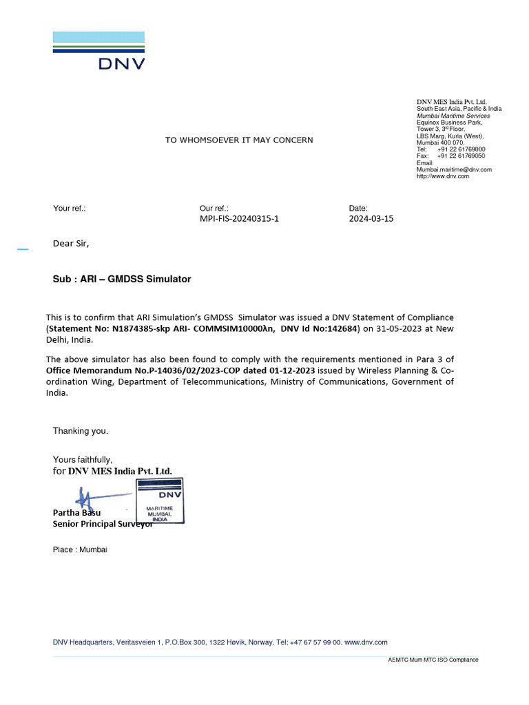 DNV Letter Approving ARISIM As Per MOC Office Memorandum 2023 | PDF