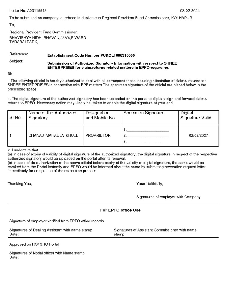 EPFO Authorized Signatory Submission Letter | PDF | Government | Public ...