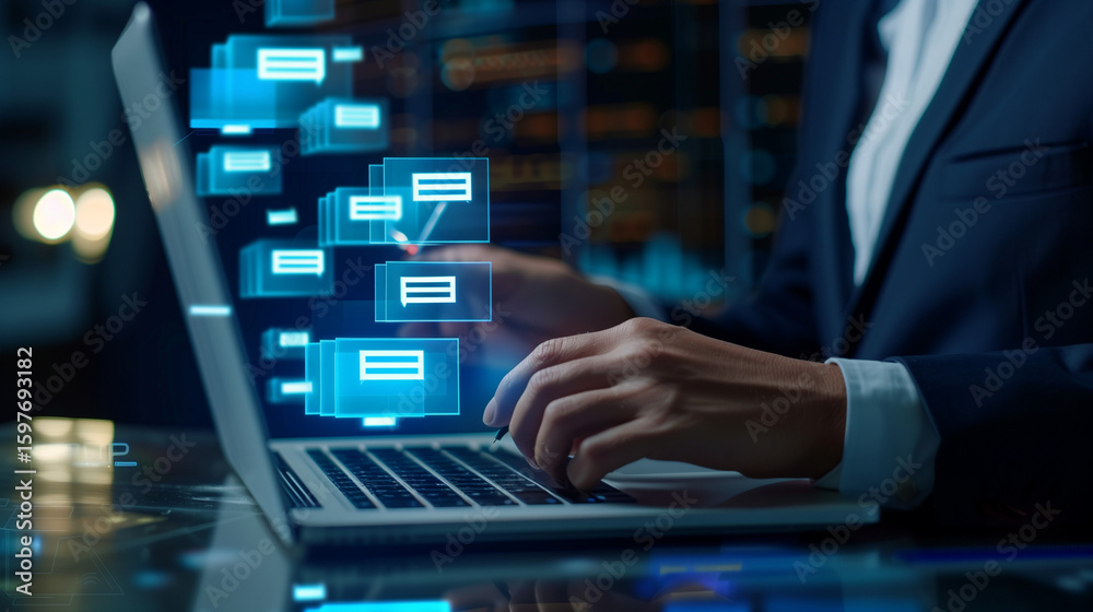 Businesswoman using laptop to Document Management System DMS. Digital ...