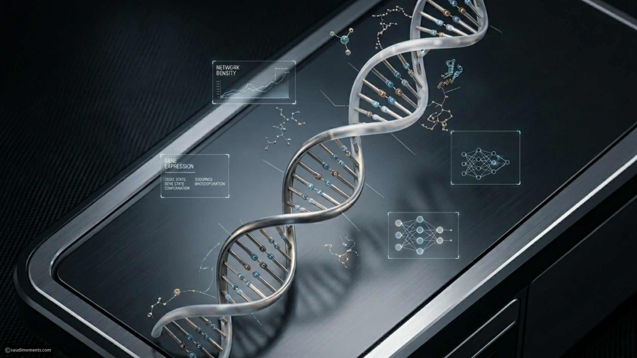 DNA double helix winding diagonally across dark wireframe grid ...