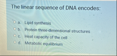 Solved The linear sequence of DNA encodes:a. Lipid | Chegg.com
