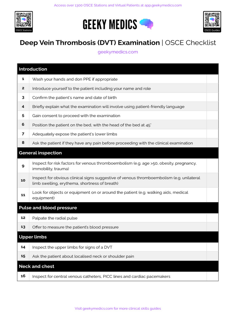 Deep Vein Thrombosis DVT Examination OSCE Checklist Geeky Medics | PDF ...