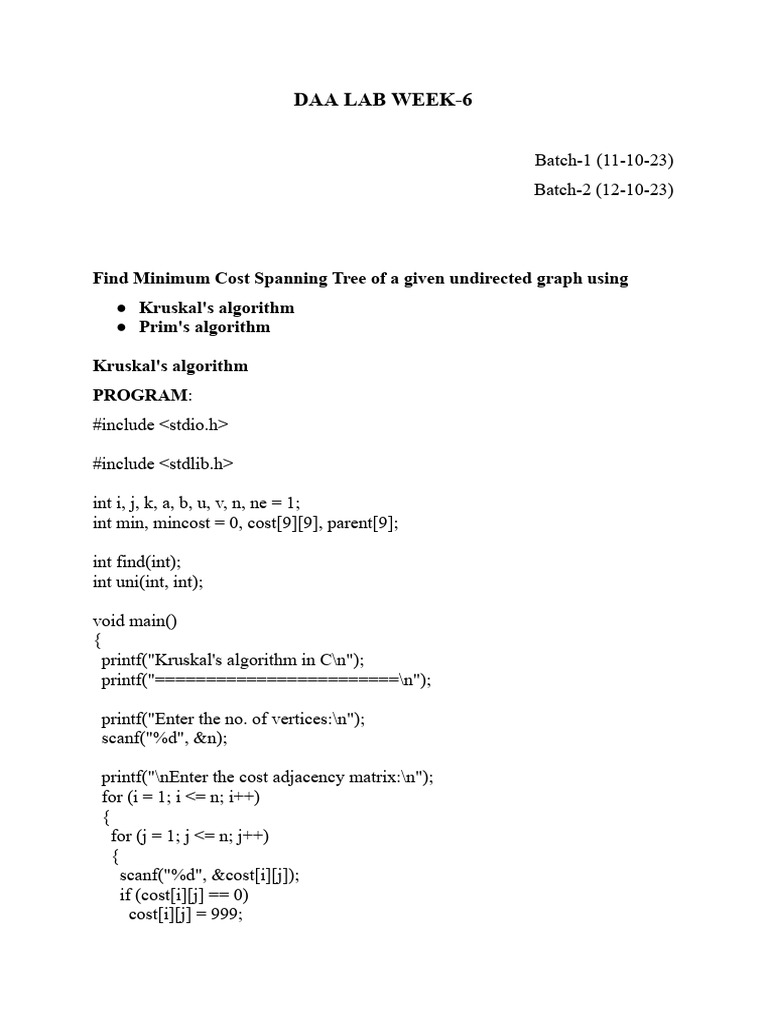 Daa Lab Week 6 - Prims & Kruskal's Algorithm | PDF | Computational ...