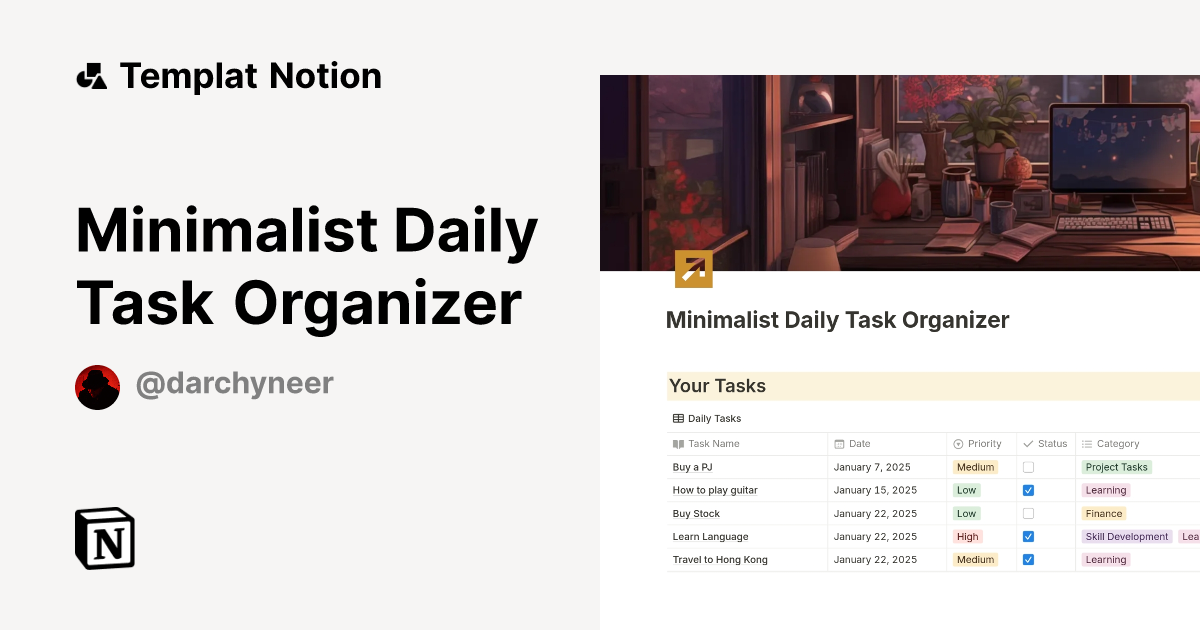 Minimalist Daily Task Organizer Templat oleh darchyneer | Notion ...