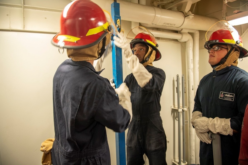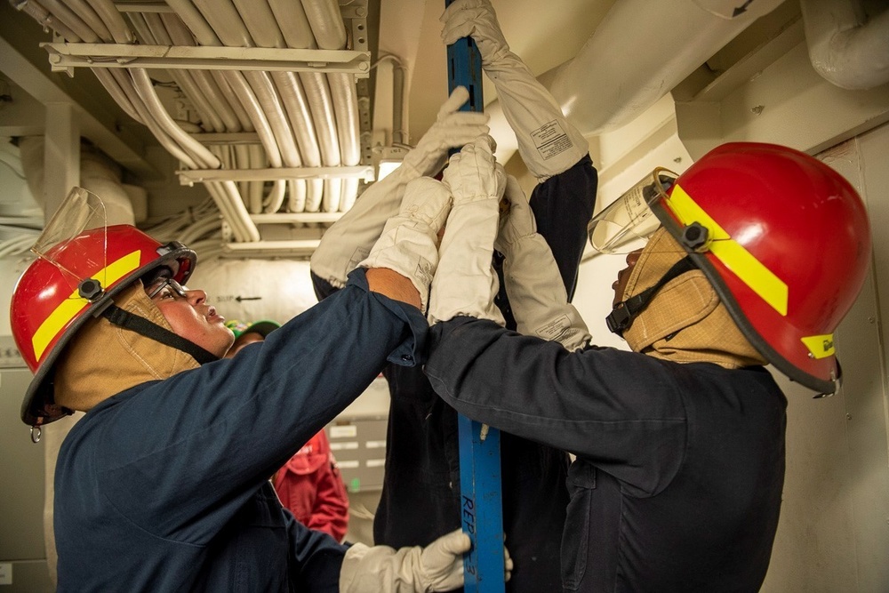 U.S. Navy Damage Controlman 1st Class right foreground, instructs Hull ...