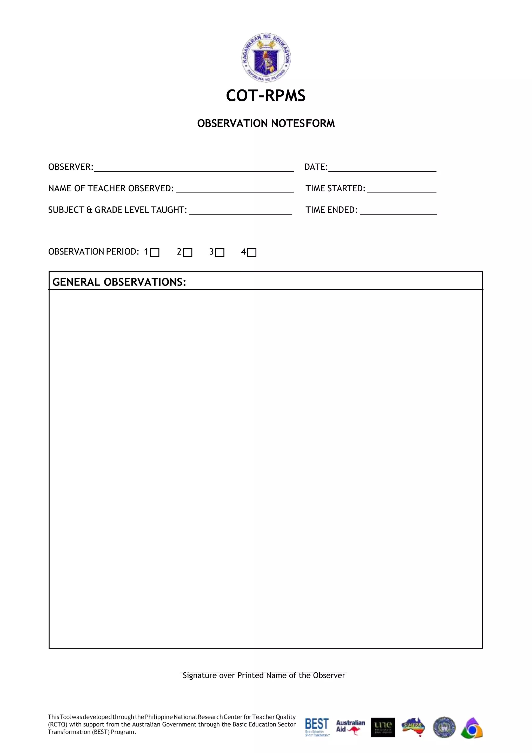 Cot-Rpms: Observation Notes Form | PDF