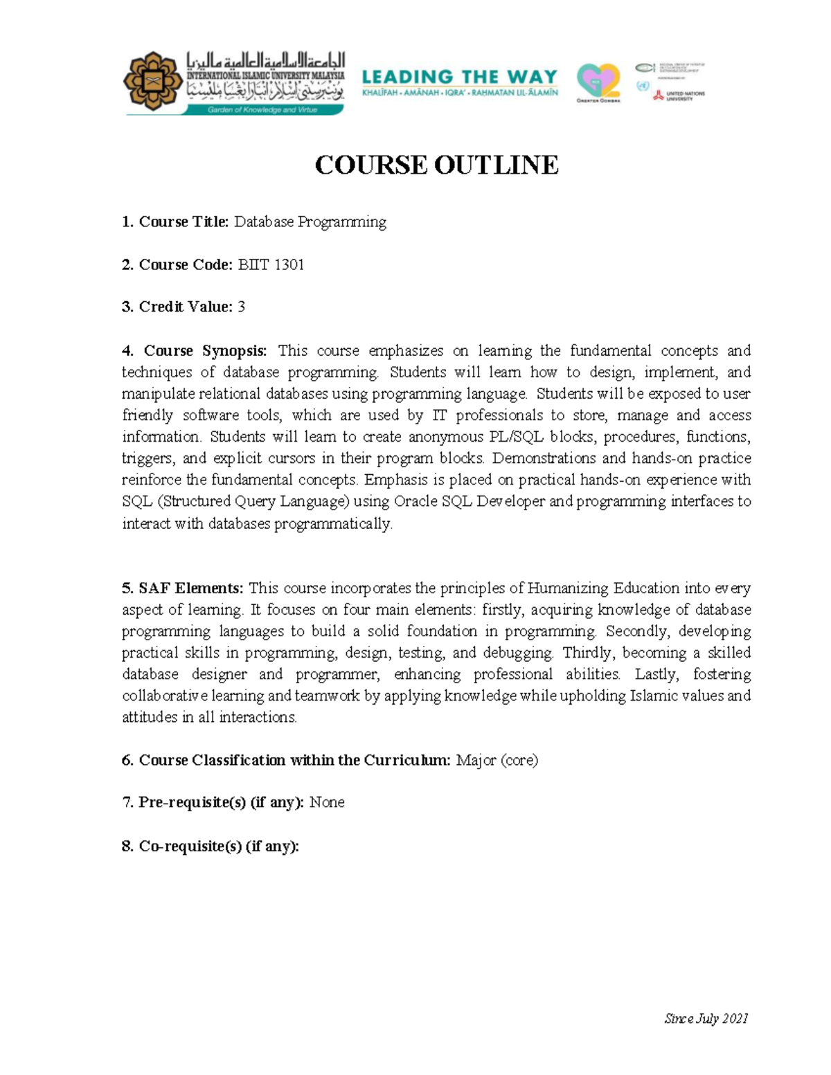 BIIT 1301 - Database Programming Course Outline and Learning Plan - Studocu