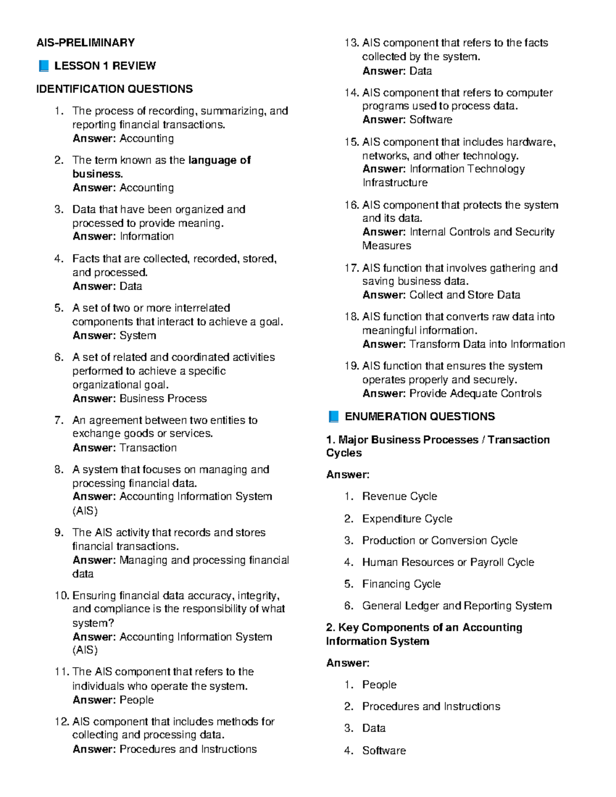 AIS-Prelim Lesson Summaries: Key Concepts and Identification Questions ...