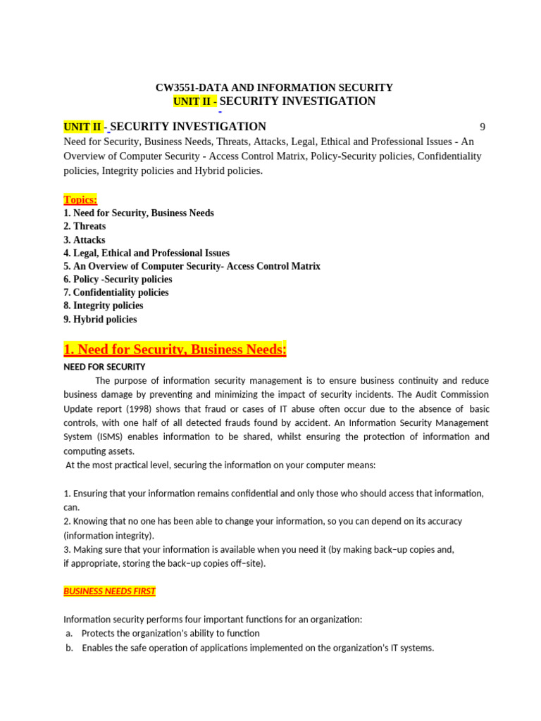 Data and Information Security - CW3551 - Notes - Unit 2 - Security ...