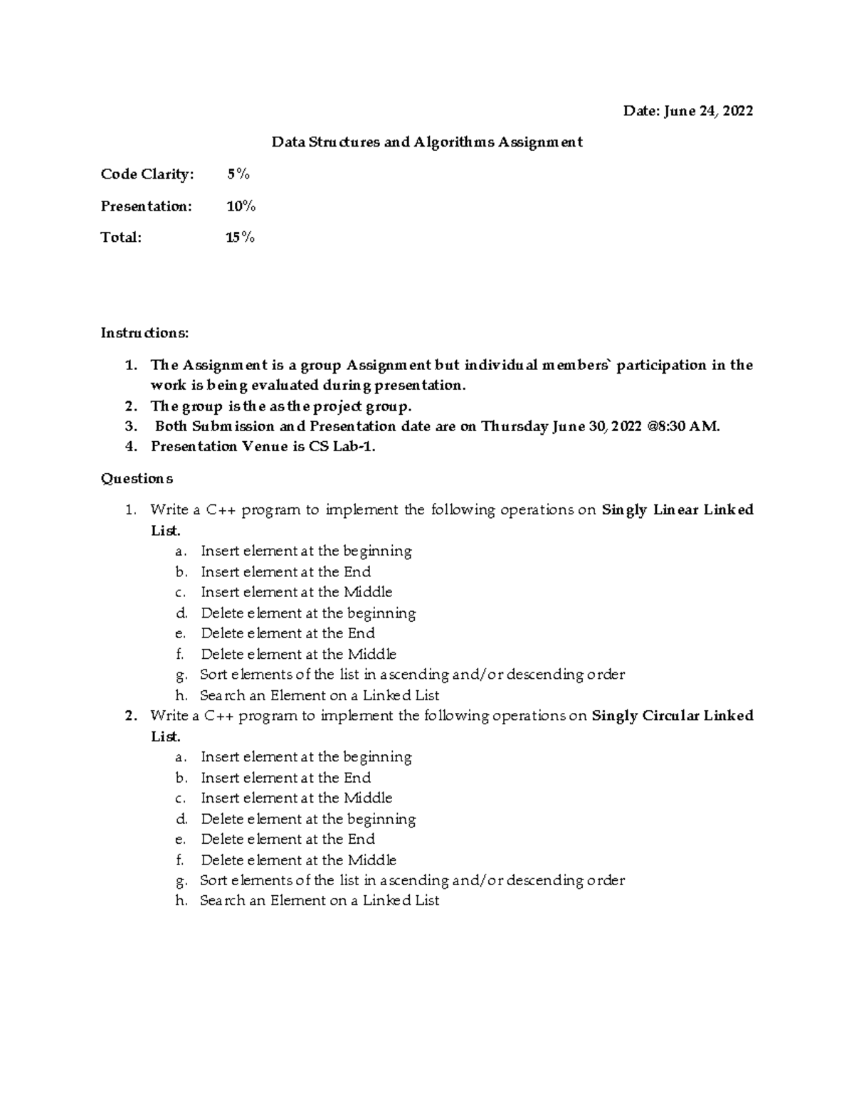 Data structure and algorithm assignment 2022 for computer science ...
