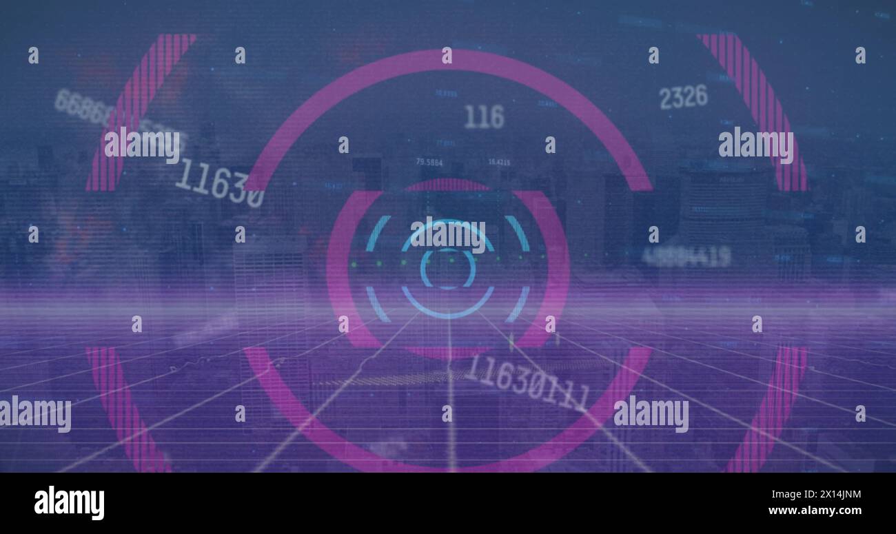 Animation of data processing and numbers over cityscape. Global ...