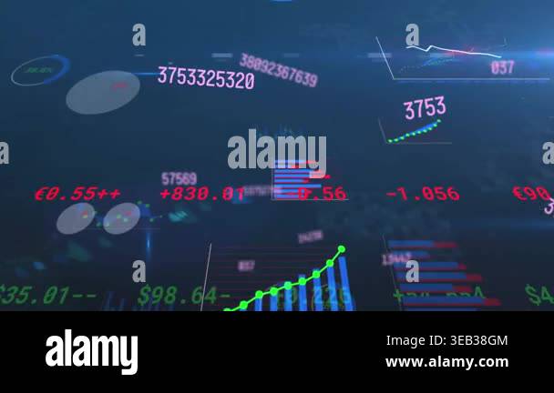Animation of numbers, processing circle and financial data on digital ...