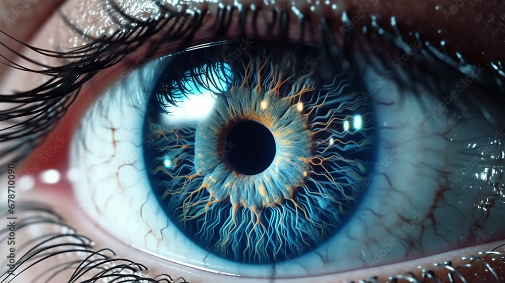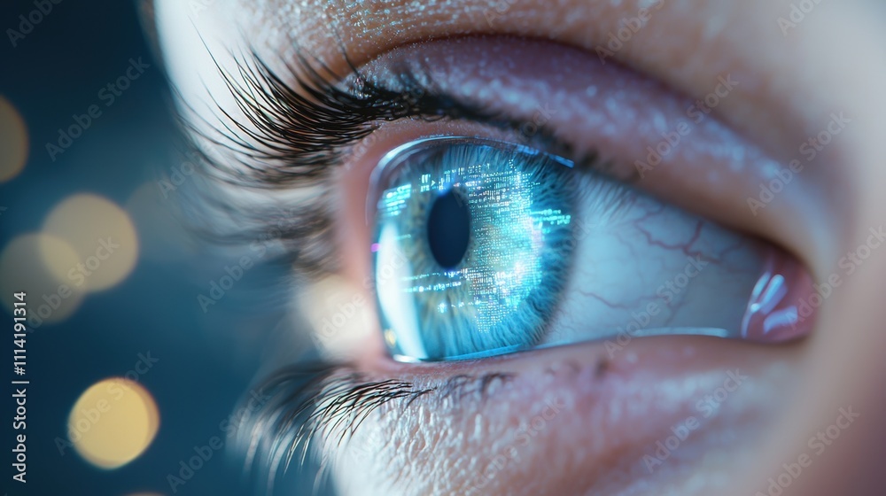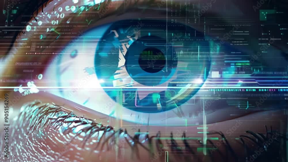 Detailed view of a human eye integrated with digital interface and data ...