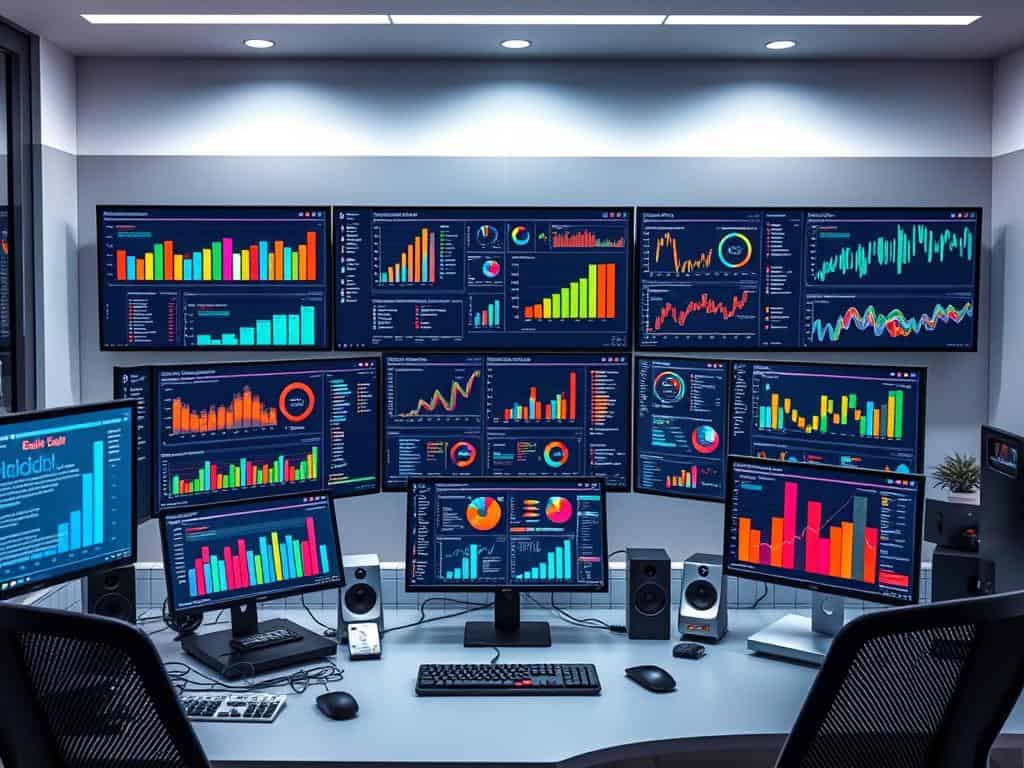 A Desktop Computer with Multiple Data Visualizations on Three Screens ...