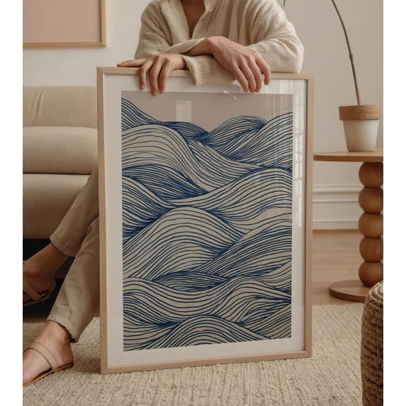 Abstract Blue Wave Line Art Print Neutral Minimalist Ocean Unframed ...