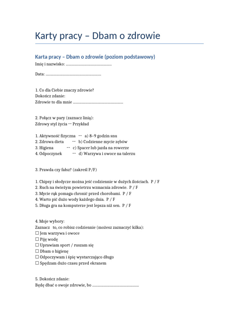 Karty pracy dbam o zdrowie - Materiały dydaktyczne