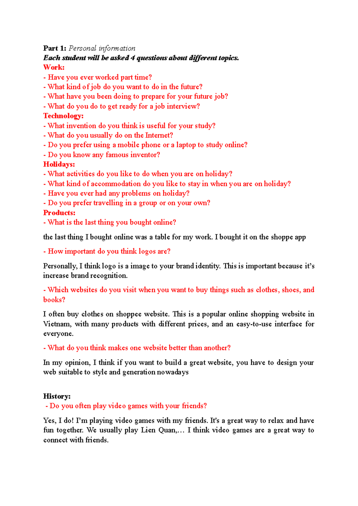 Part 1- Speaking - dbdbdb - Part 1: Personal information Each student ...