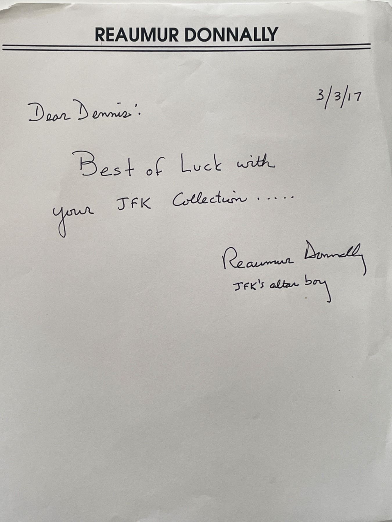 JFK funeral altar boy Reaumur Donnally signed note