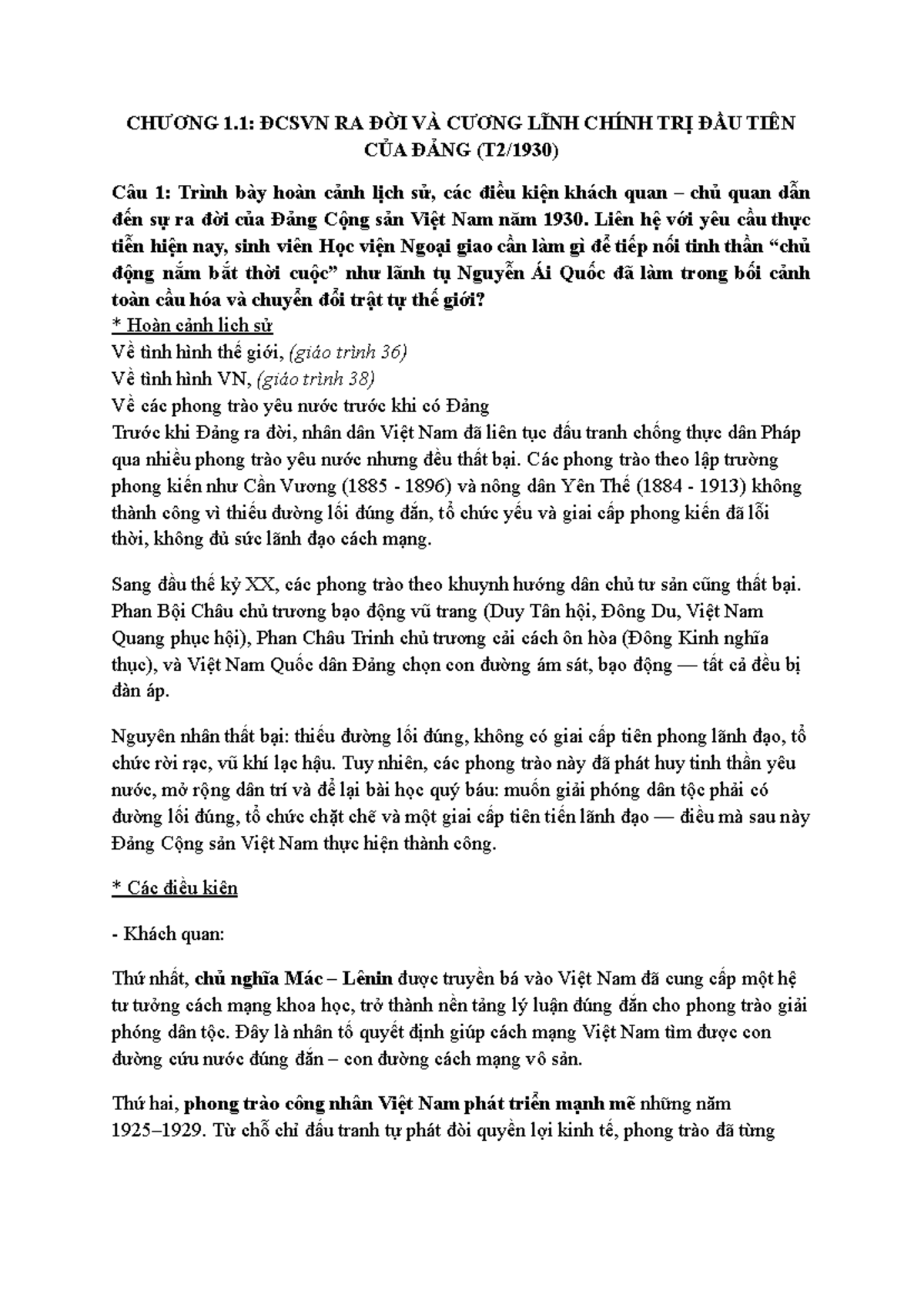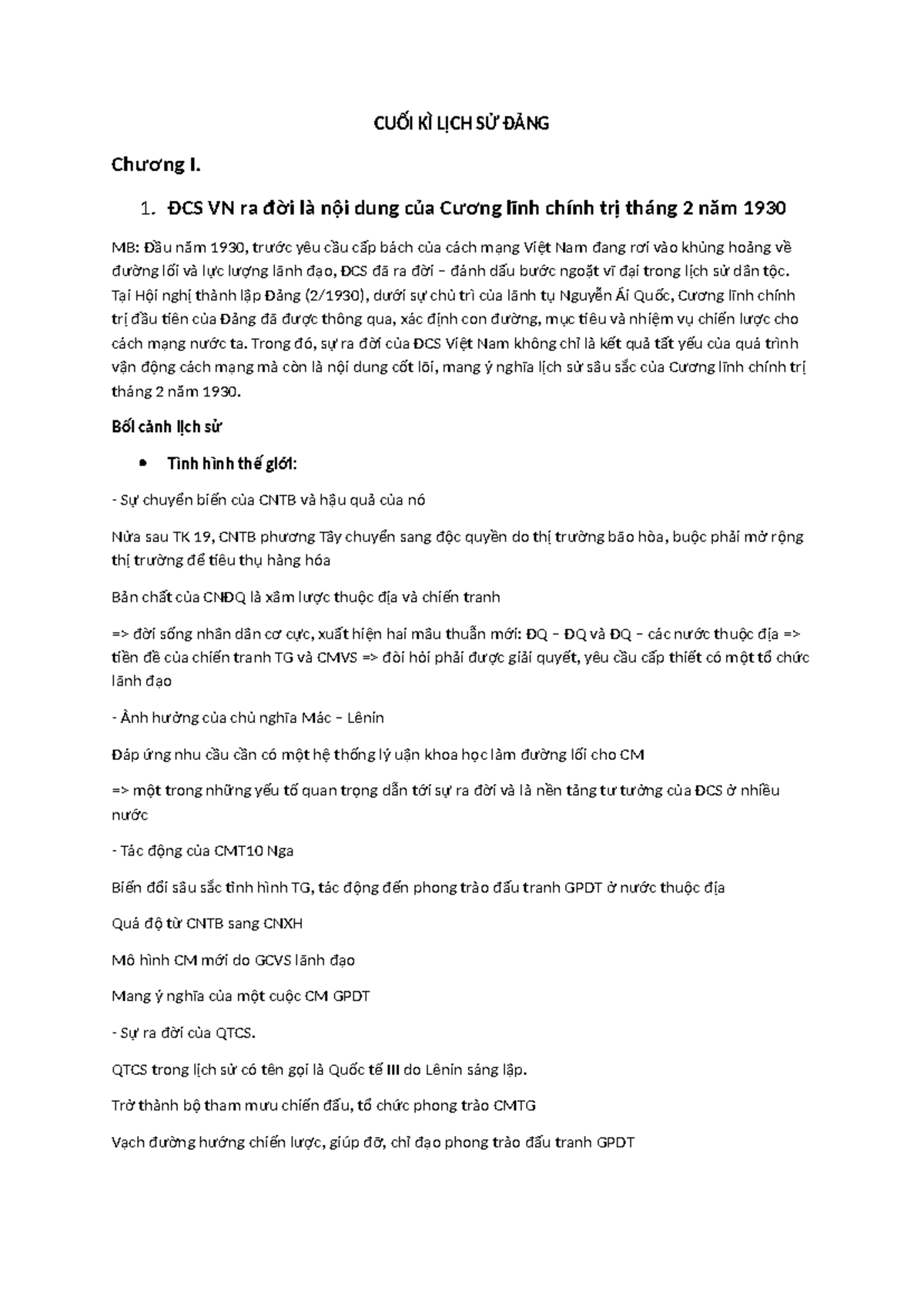 CUỐI KÌ LỊCH SỬ ĐẢNG - Ôn Tập Chương I: ĐCS VN và Cương Lĩnh 1930 - Studocu