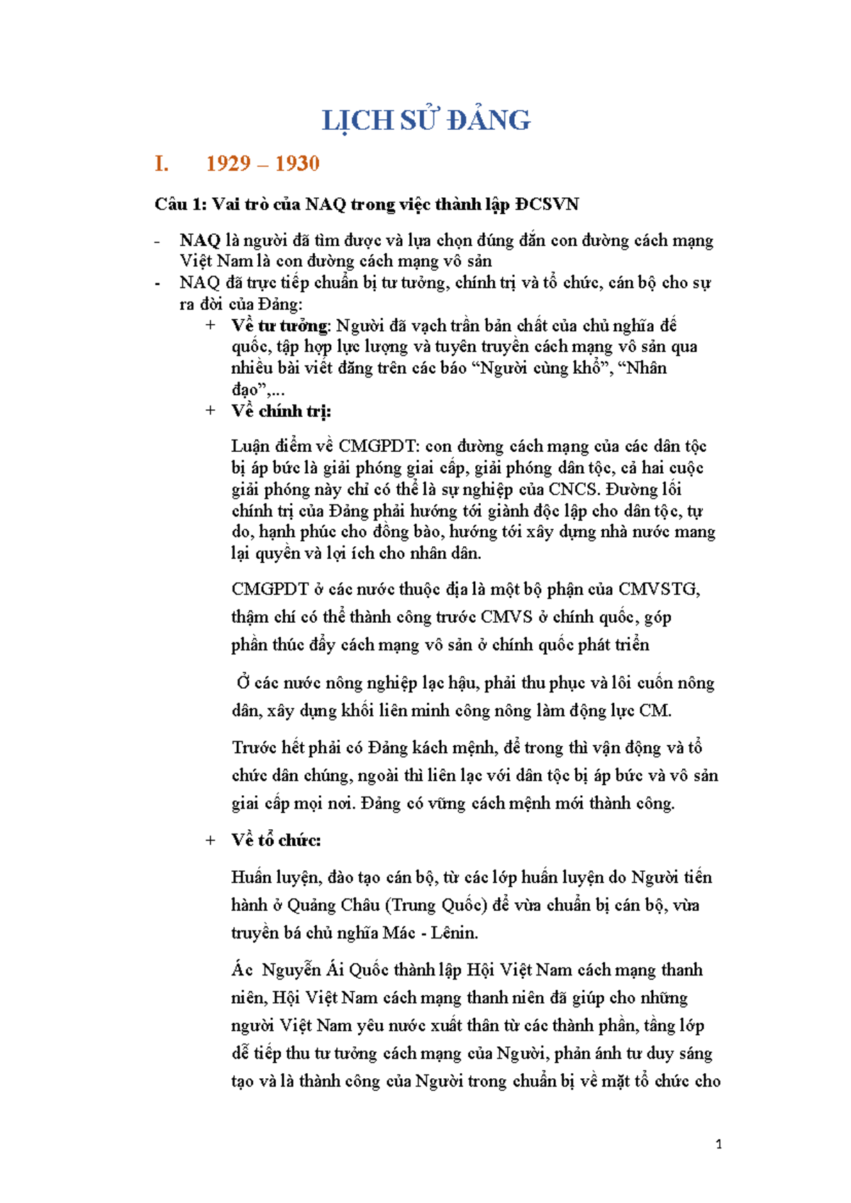 LỊCH SỬ ĐẢNG I: Vai Trò của NAQ và Sự Ra Đời ĐCSVN (1929-1930) - Studocu