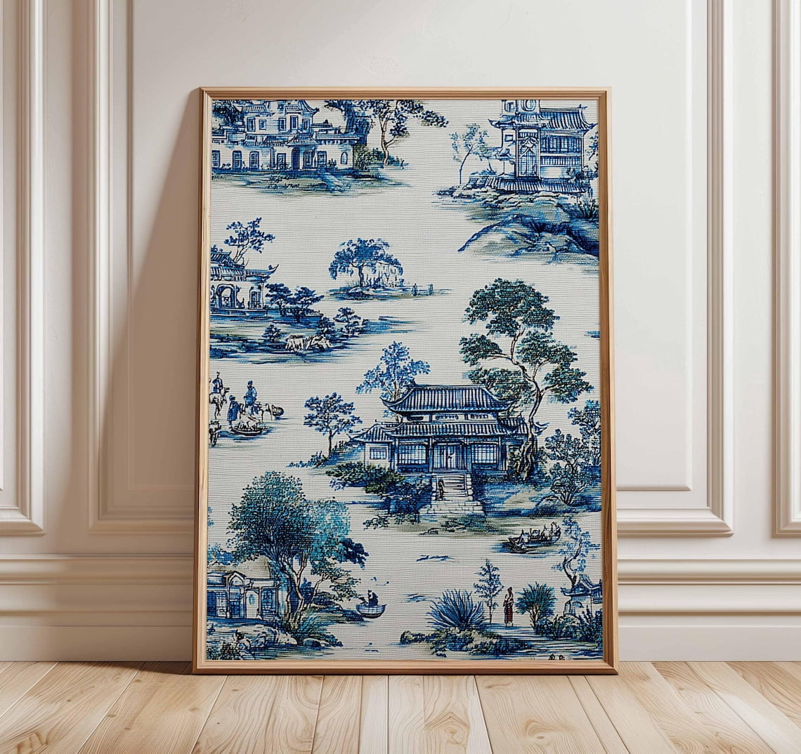 Vintage Toile Blue and White Asian Landscape Chinese Pavilion Scene Art ...
