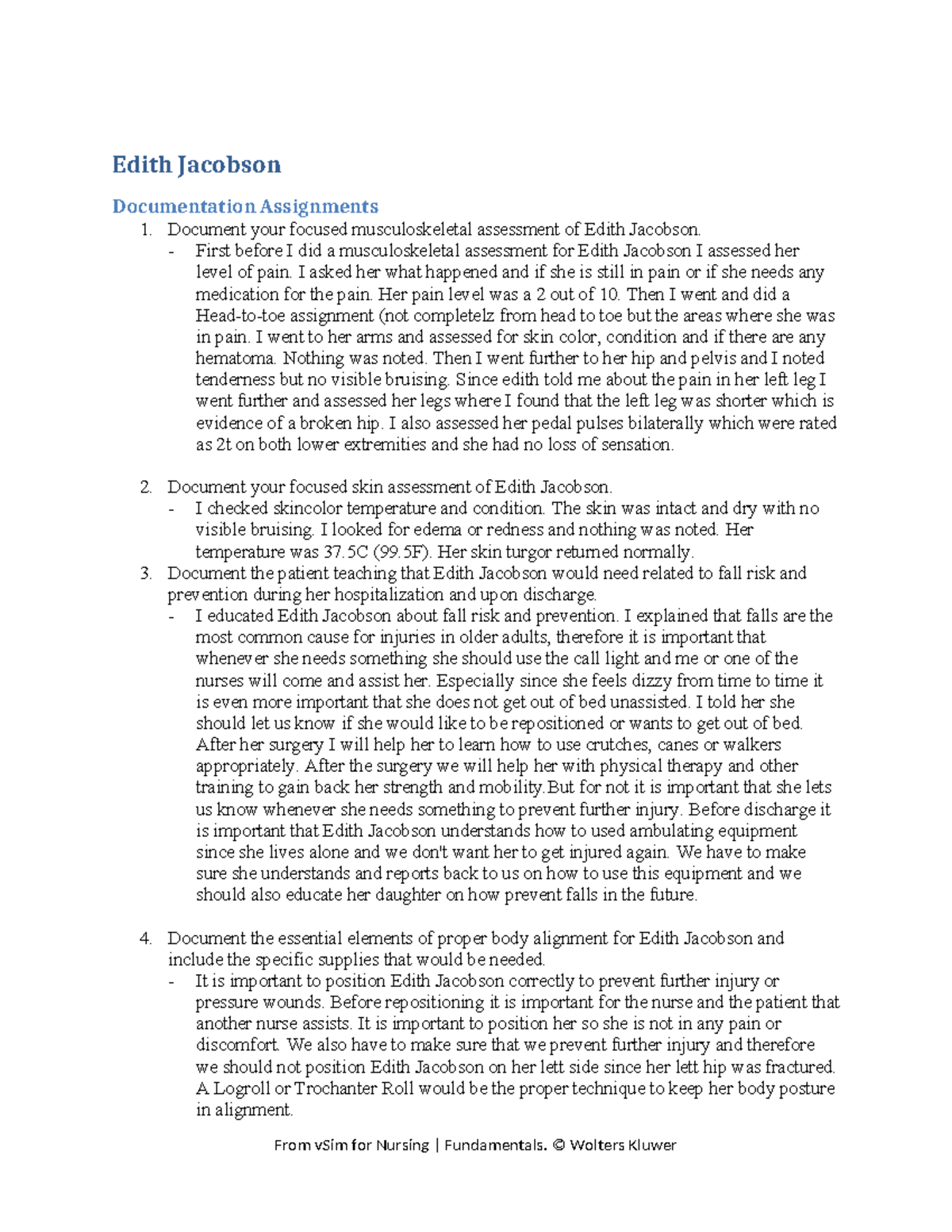 NUR 101: Documentation Assignments for Edith Jacobson's Assessments ...