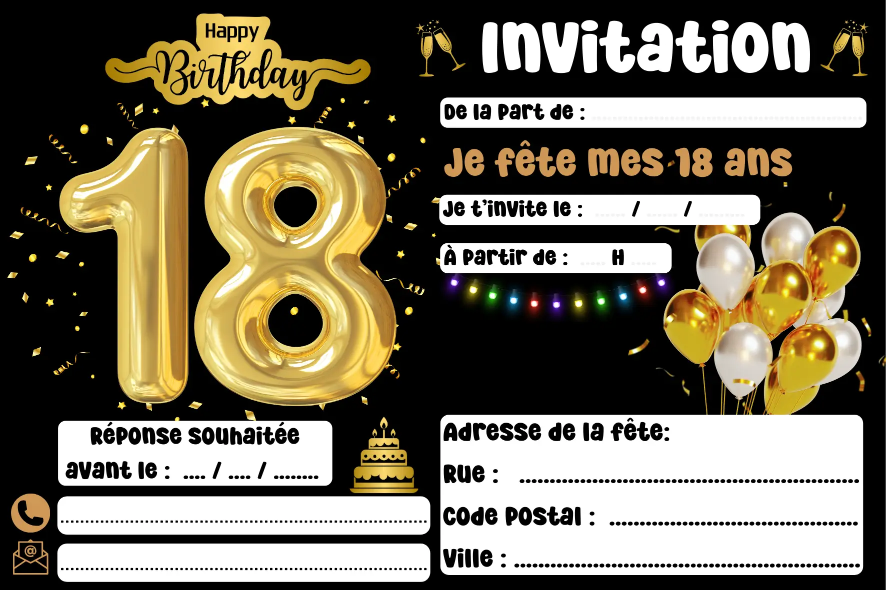 > Carte invitation anniversaire 18 ans à imprimer 𝐆𝐫𝐚𝐭𝐮𝐢𝐭𝐞