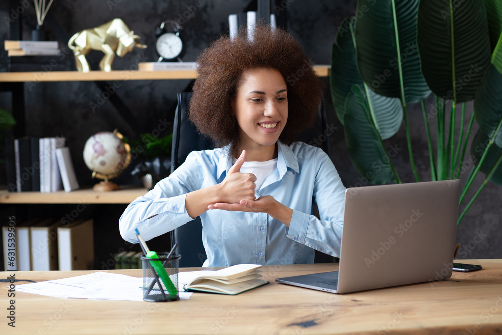 African American Woman Using Laptop Communicate With Deaf Language At ...