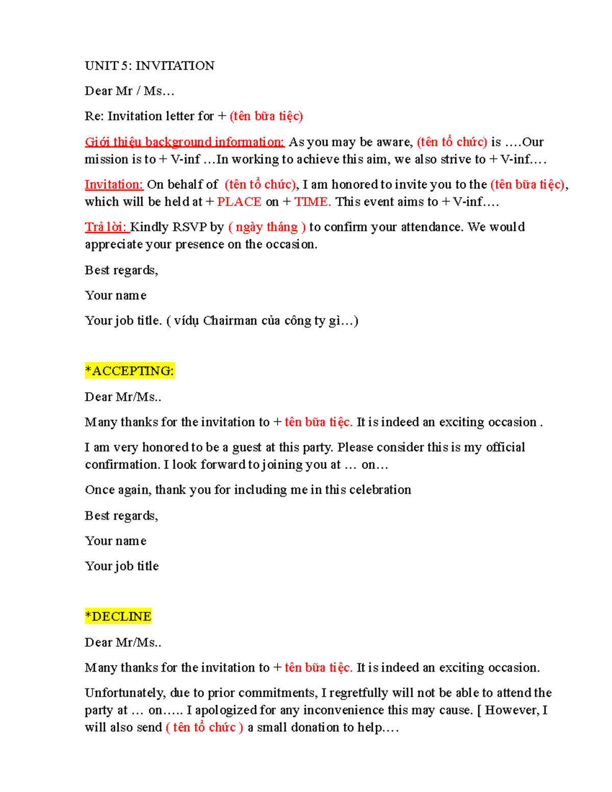 UNIT 5 - Tiếng anh chuyên ngành - UNIT 5: INVITATION Dear Mr / Ms... Re ...