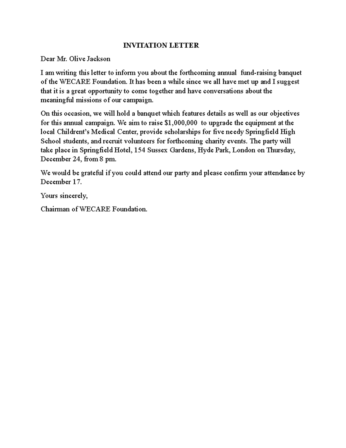 Invitation letter - INVITATION LETTER Dear Mr. Olive Jackson I am ...