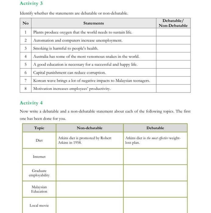 Solved DEBATABLE AND NON-DEBATABLE STATEMENTS An | Chegg.com