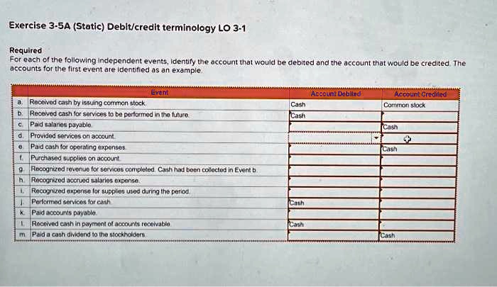 SOLVED: Exercise 3-5A (Static) Debit/credit terminology LO 3-1 Required ...