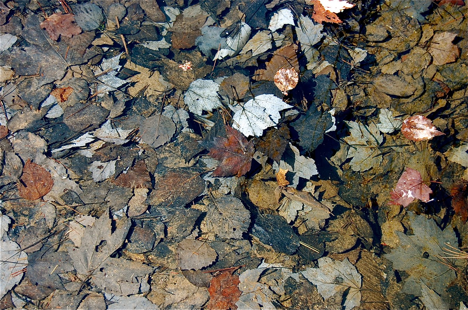 Leaf decay. Fallen leaves that are decaying as they decompose ...